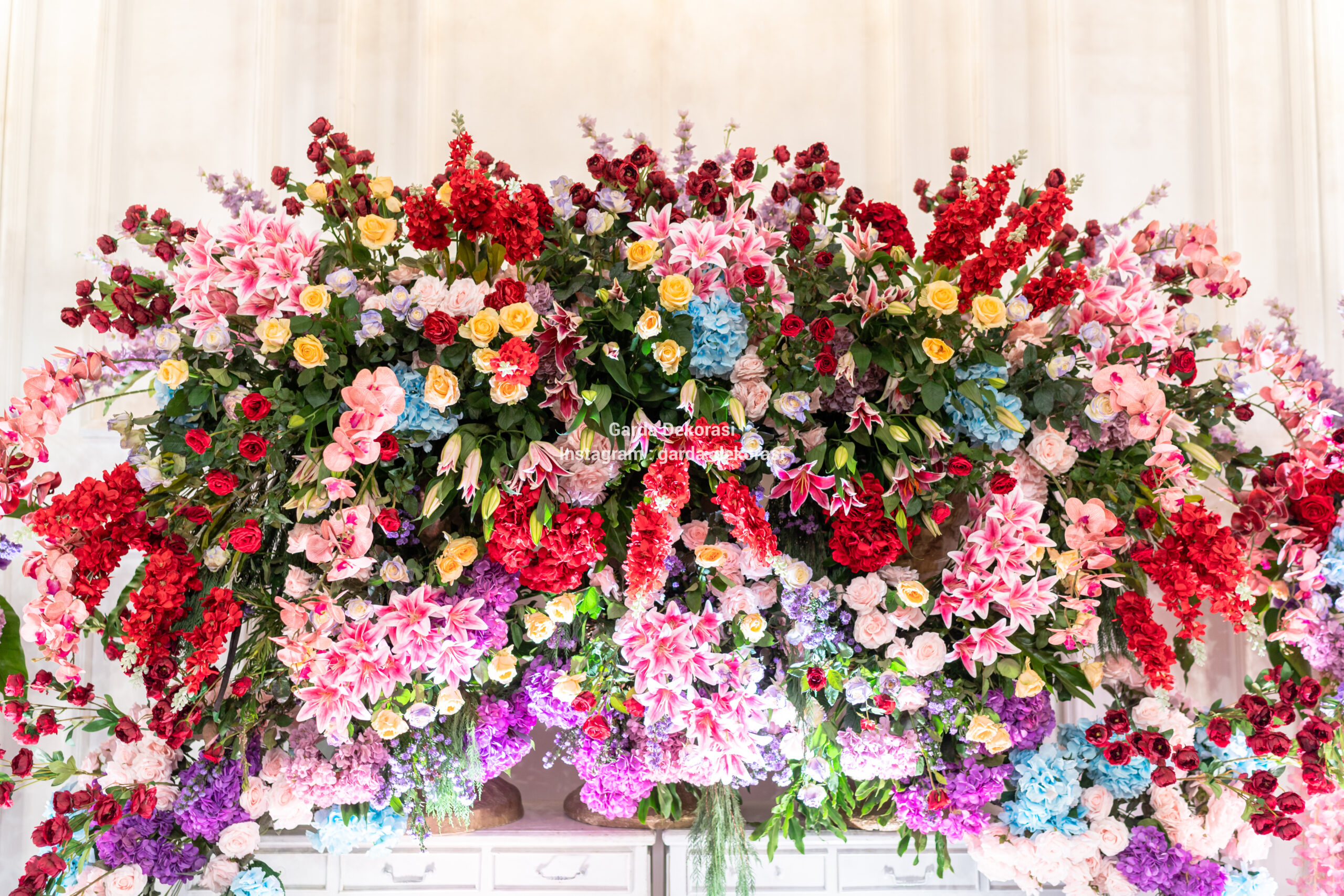 Gaya Kolonial memadukan unsur rumah Belanda tempo dulu dengan dominasi warna putih dan sentuhan bunga berwarna cerah, menghasilkan tampilan yang elegan dan hangat.